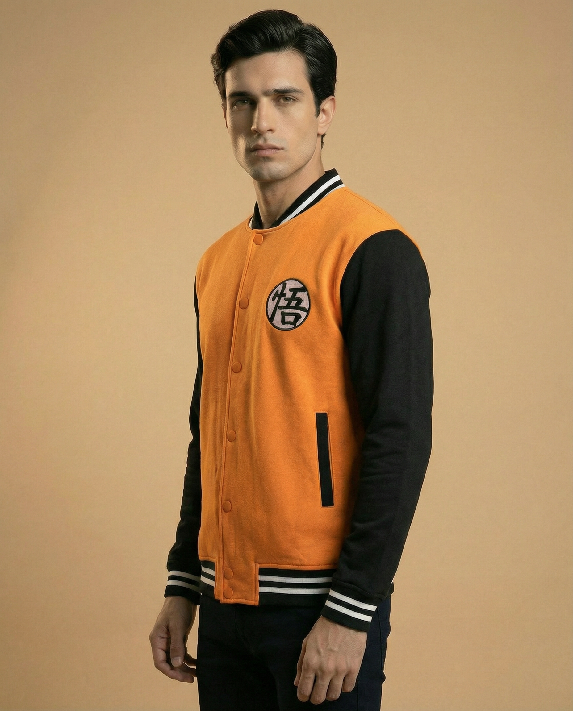 Chaqueta estilo universitario (Varsity) de corte regular fit con certificación oficial Dragon Ball Z®. Su diseño combina el icónico tono naranja con mangas en contraste negro, destacando el kanji "Go" (Sabiduría) bordado en pecho y espalda con acabado de alta densidad.Confeccionada en tejido mixto de gramaje medio-alto para un aislamiento térmico eficaz sin perder ligereza. Incorpora cierre de botones a presión (snaps) reforzados y cuello, puños y bajo en canalé elástico bicolor indeformable.Disponibilidad limitada en stock. Una prenda exterior de colección que fusiona el estilo urbano clásico con la estética oficial de la saga.