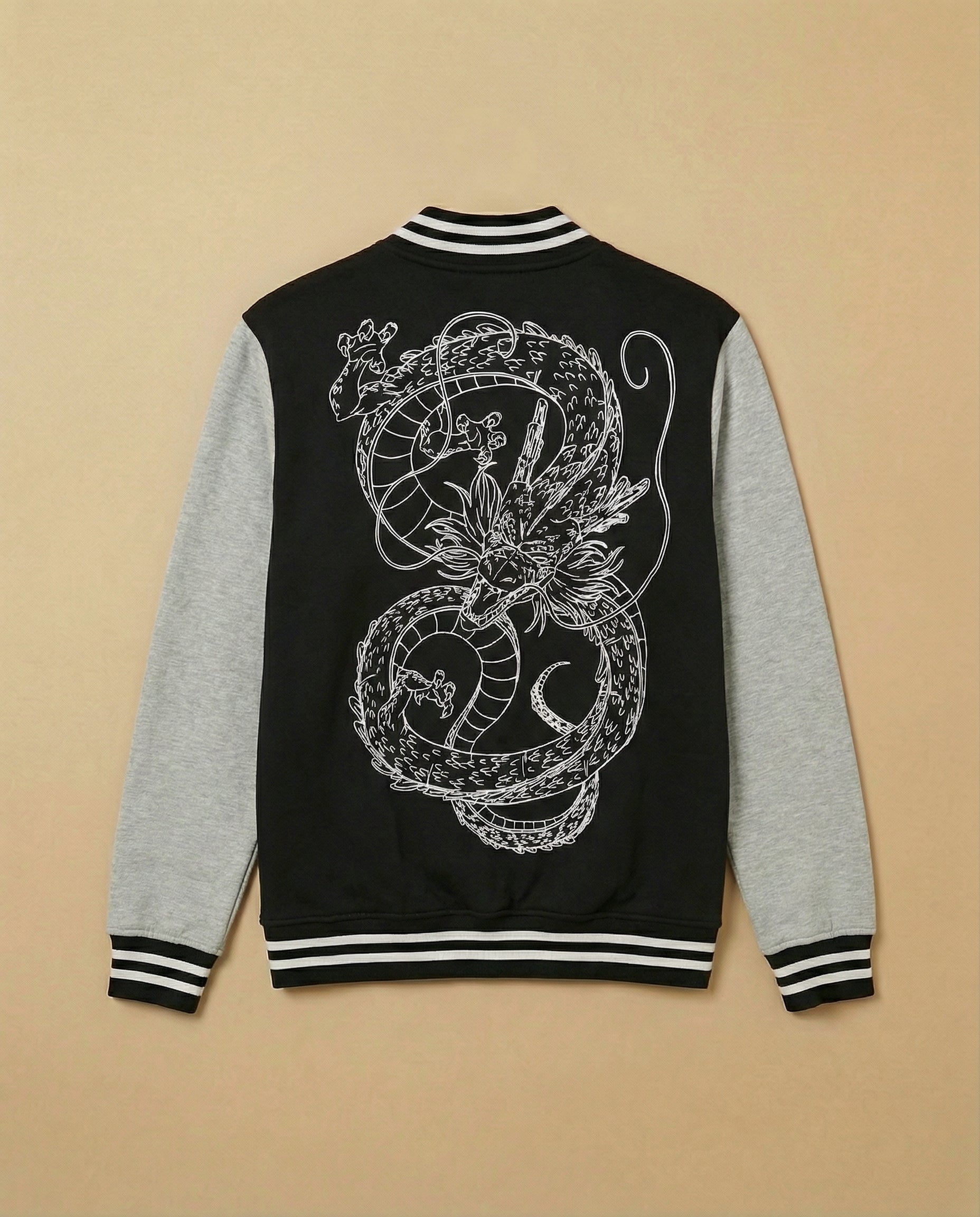Chaqueta estilo universitario (Varsity) de corte regular fit con certificación oficial Dragon Ball Z®. Diseño bicolor negro/gris con escudo frontal minimalista y gráfico trasero de gran formato en trazo lineal de Shenron, para un acabado sobrio y muy marcado.