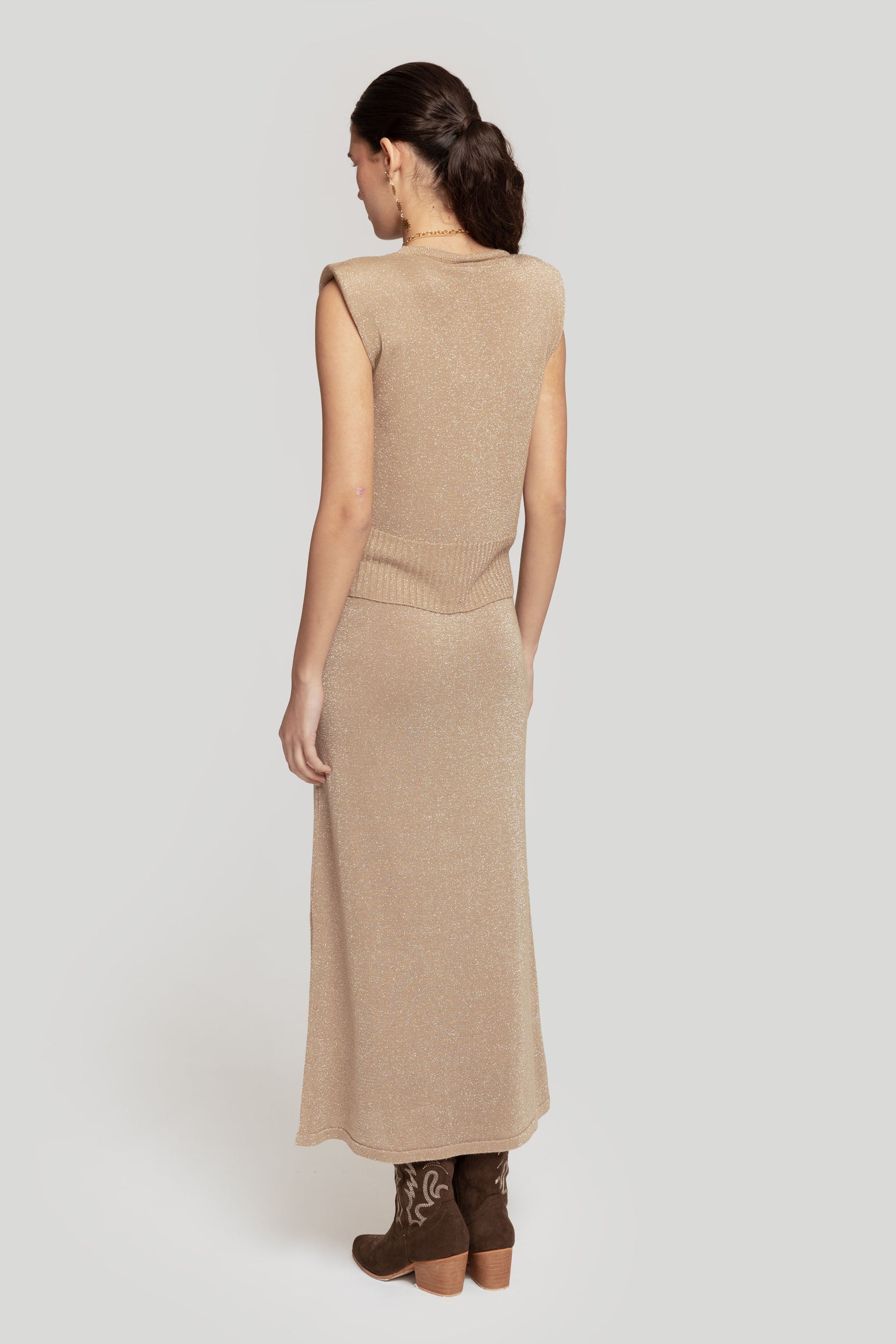 La Falda Luz Serena es una prenda versátil con un toque de sofisticación. Su tejido de punto fino con sutil brillo aporta elegancia, mientras que su diseño recto y cintura elástica garantizan un ajuste cómodo y favorecedor. Perfecta para looks casuales o formales con un aire refinado.