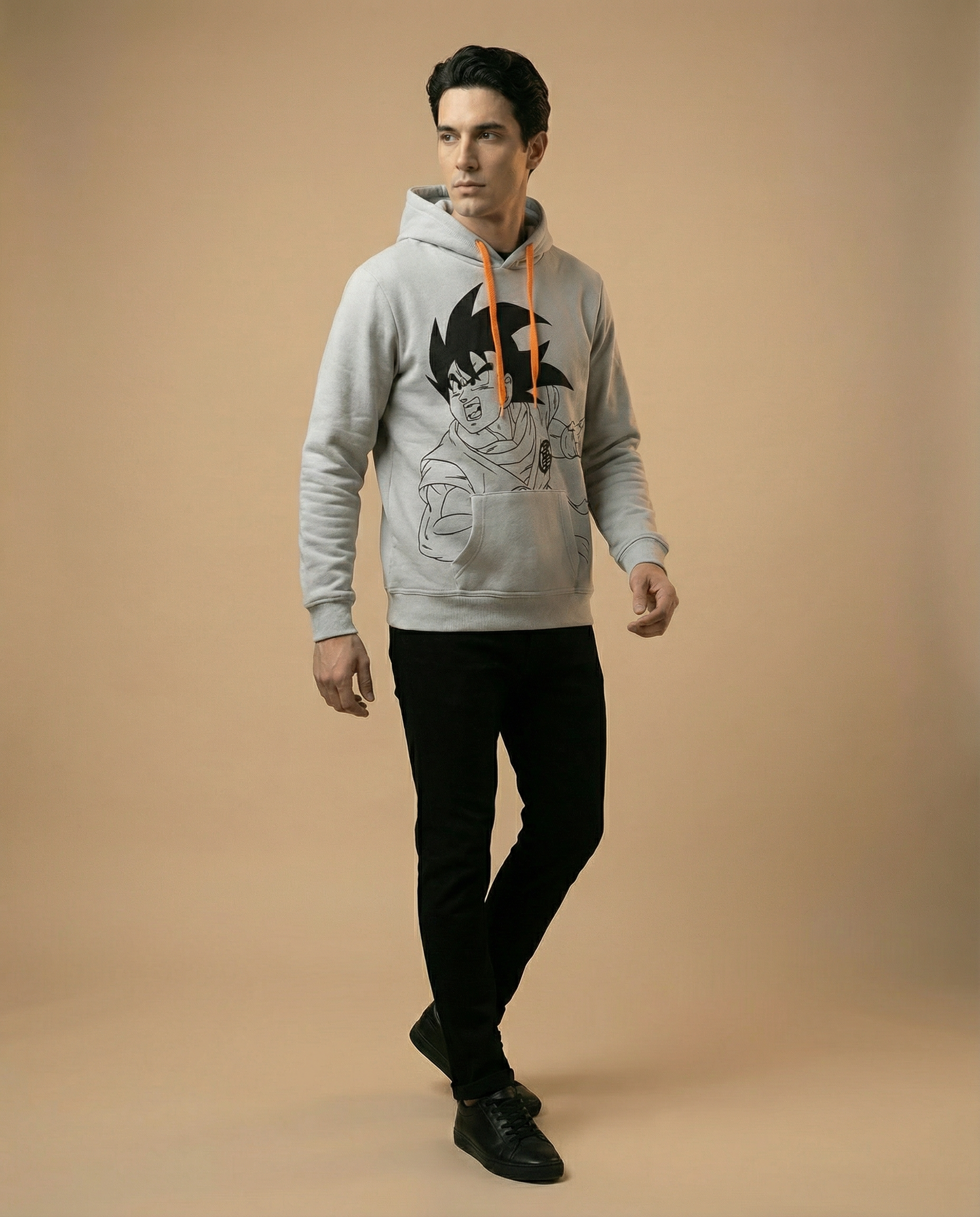 Presenta un diseño gráfico estilo "Line Art" (trazo lineal) en negro de alto contraste: silueta de Goku en el frontal y panel vertical de personajes en la espalda.Confeccionada en felpa de gramaje medio con interior suave.
