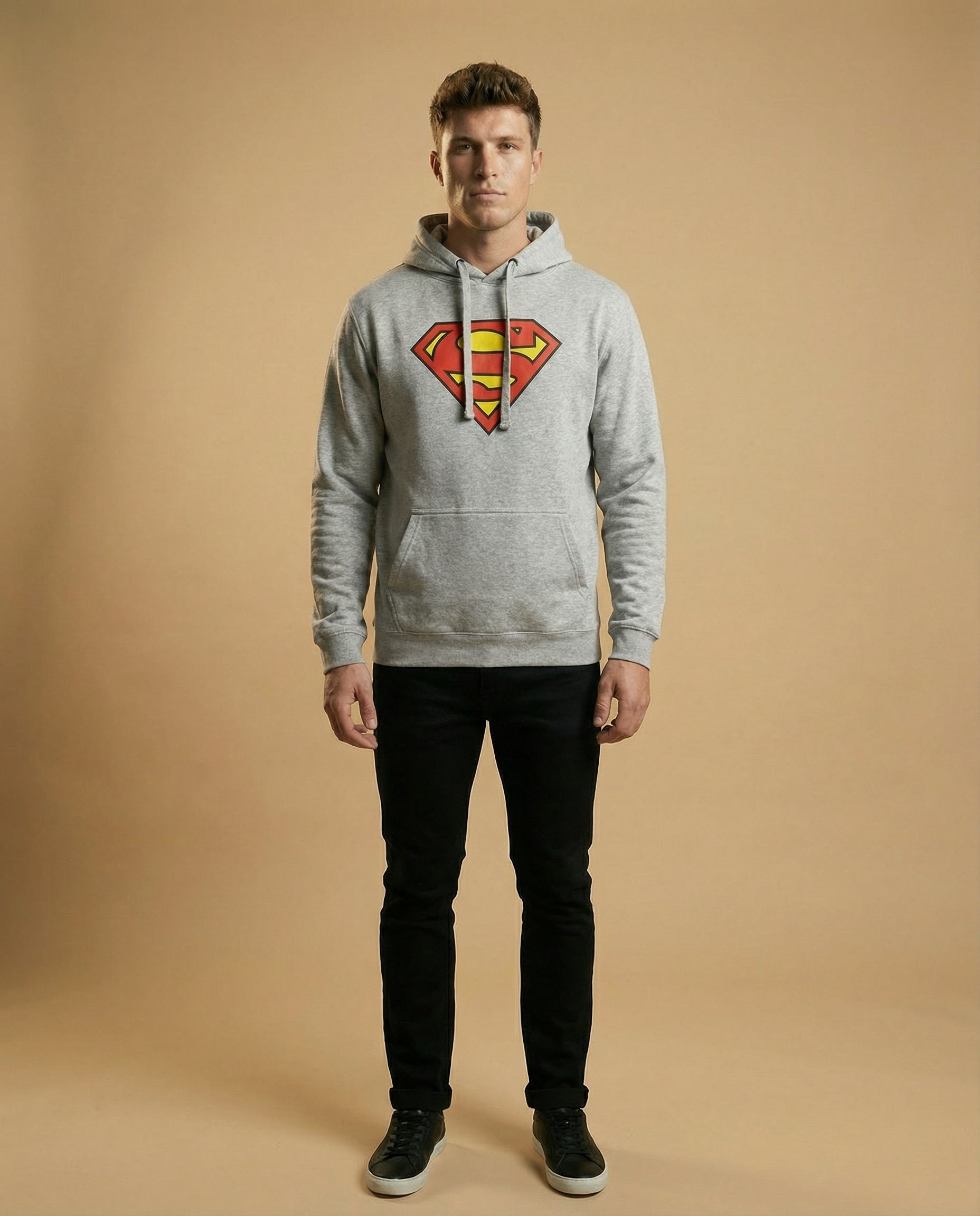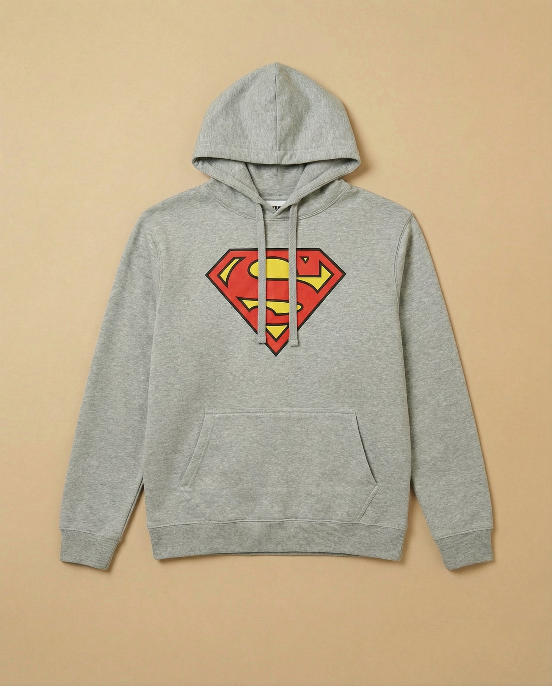 Sudadera de corte regular fit en tono gris vigoré con certificación oficial Superman® (DC Comics). Diseño central icónico con el escudo de la "S" en un acabado estilo "tejido vintage", que aporta textura y relieve visual sin perder flexibilidad.